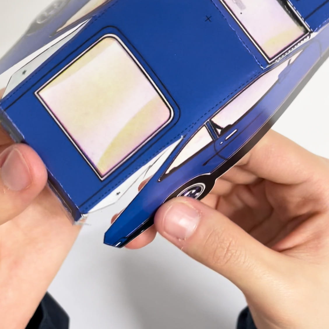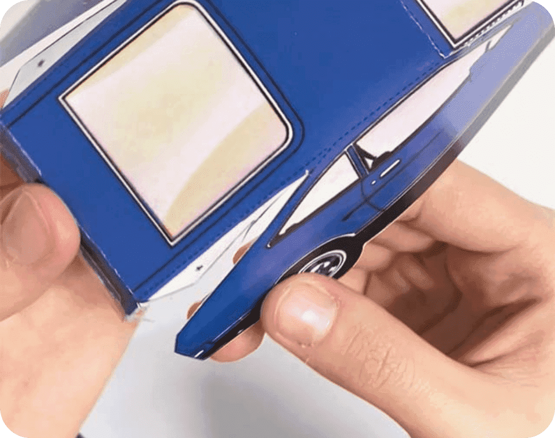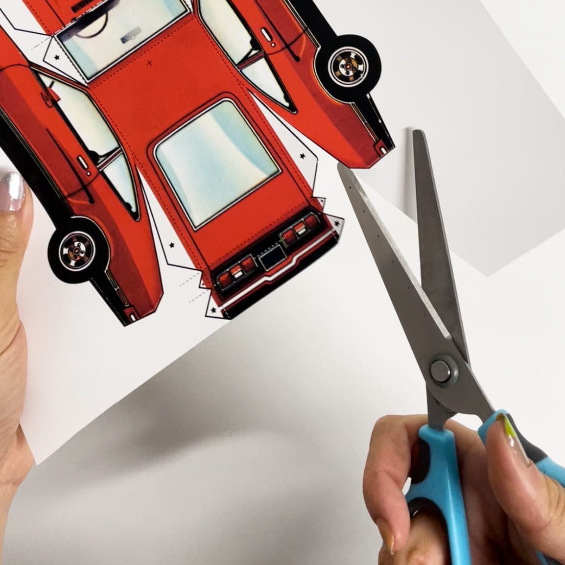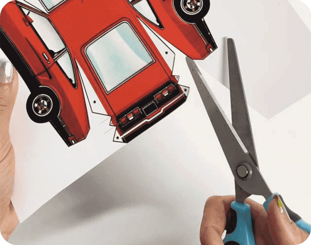スポーツカーの台紙の左上にある線の説明を確認し、キリトリ線で切り抜きます。